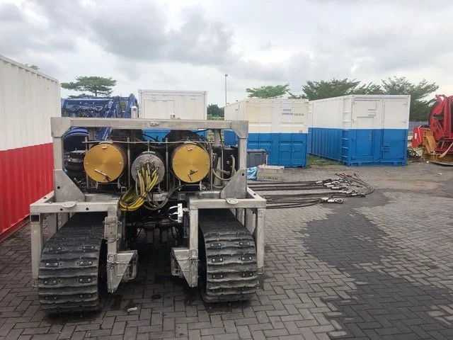 The T450 trencher is based on the Triton TMRV well proven ROV system, connected with a high flow water jet trenching system, powered by 300Hp directly driven 3300 Vac motors, and 150Hp HPU for propulsion and tools, total of 450Hp capacity. Use of topside frequency inverter to regulate the motor speed.
